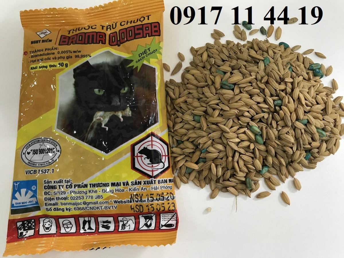 Thuốc diệt chuột hạt thóc Broma 0.0005AB, gói 50g là bả diệt chuột làm cho lũ chuột rất thích. Thành phần : Bromadilone 0,005% w/w và hạt thóc ( lúa ), ngũ cốc