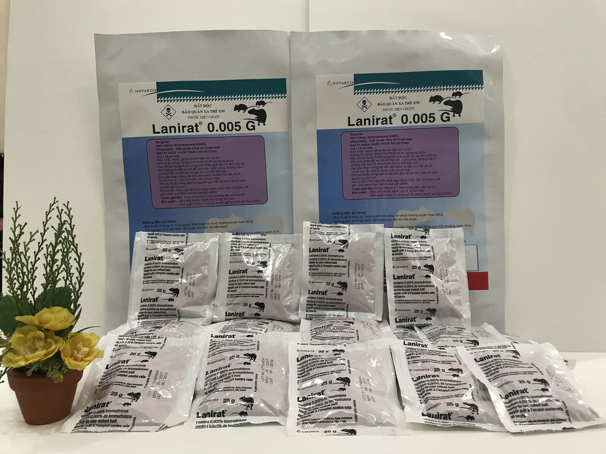 Thuốc diệt chuột Lanirat gói 25g, sản phẩm của USA, chuột không thể chê khi nhìn thấy bả. Lanirat là hạt gạo tẩm thuốc màu hồng đỏ.