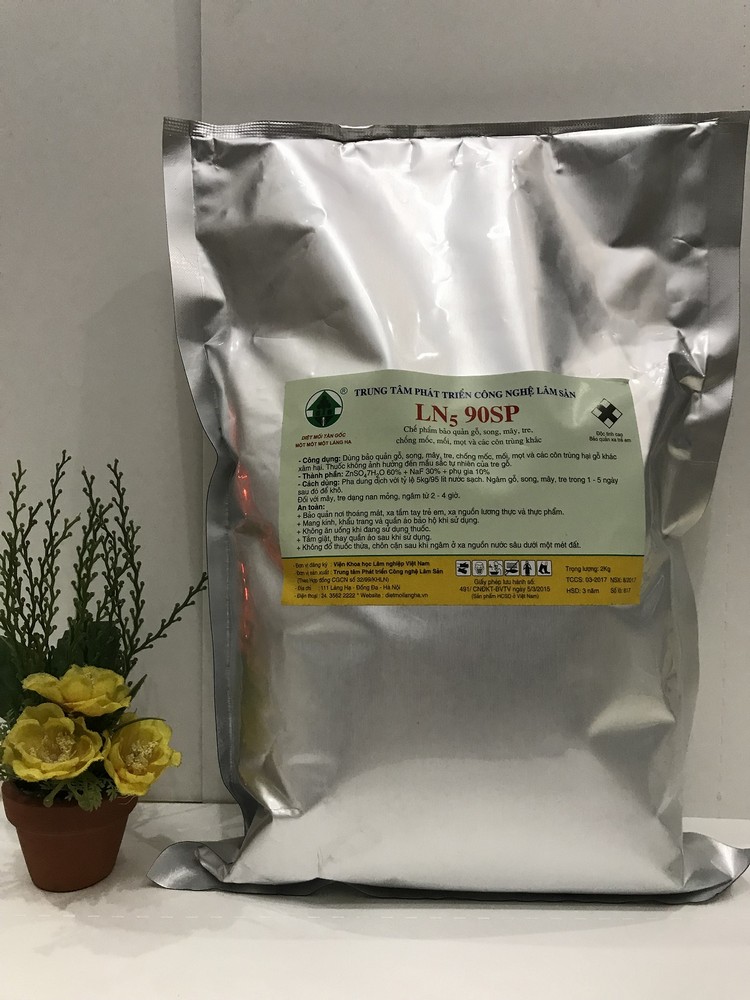 LN5 90 bột: Thuốc ngâm tẩm gỗ, song, mây, nứa chống mối, mọt, mốc: sản phẩm của Viện Khoa Hoc lâm nghiệp Việt Nam.