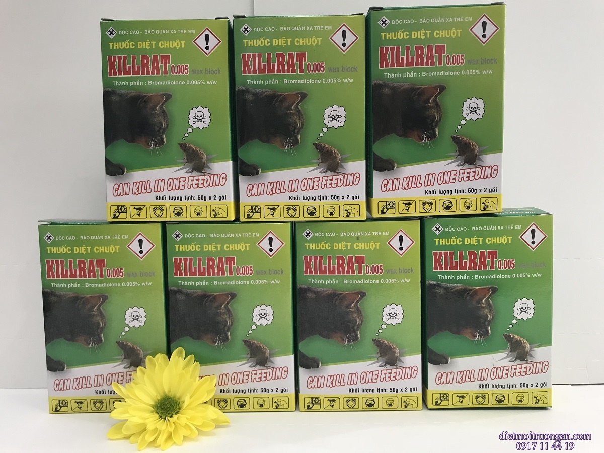 Thuốc diệt chuột Killrat hộp 80gam, giá 35.000 đ/hộp. Thuốc gây xuất huyết mắt nên khi chết chuột có nhu cầu tìm ra chỗ sáng, giúp ta dễ nhặt xác chuột.